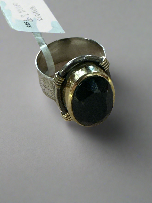 Polished Black Onyx Sterling Silver & Brass Ring Size 7