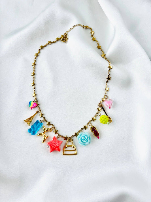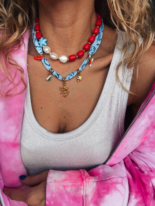 Bohemian Blue Bandana Charm Necklace with & Colorful Beaded Fish