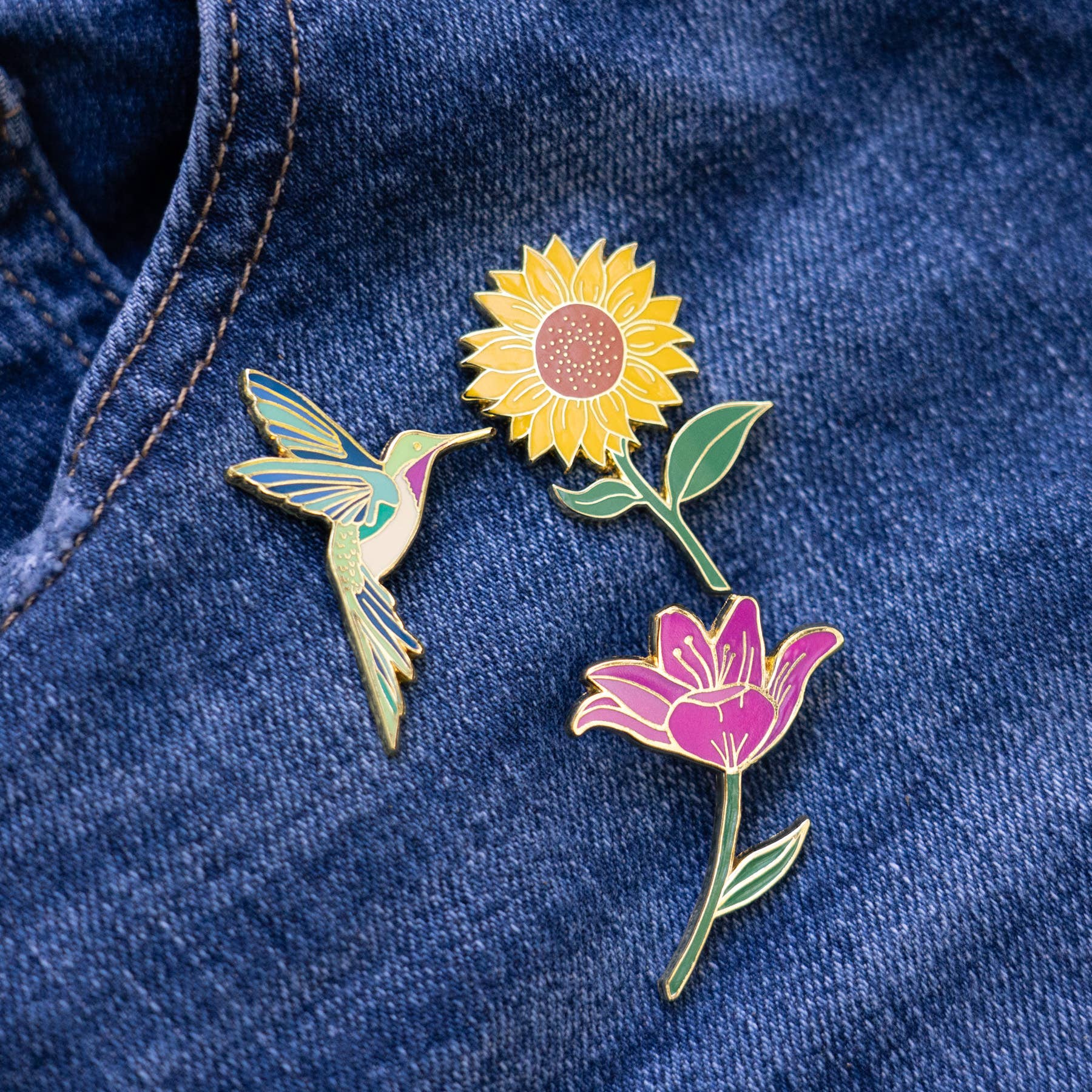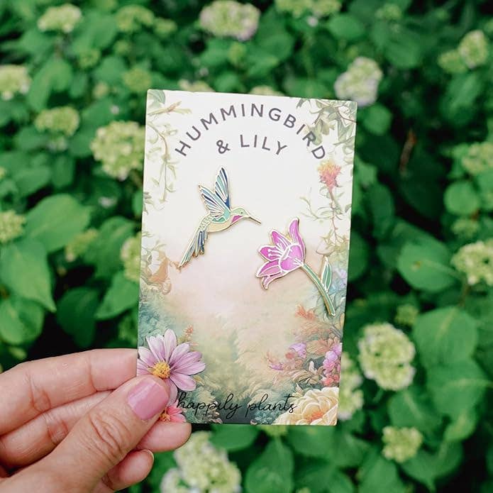 The Hummingbird & Lily Flower Lapel Pin Two-Piece Set is the perfect addition to any accessory collection, designed by HAPPILY PLANTS in New Jersey. We specialize in nature-inspired jewelry. This lapel pin is beautifully crafted out of high-quality zinc alloy and hard enamel with a gold finish. This set of pins offers a sweet and subtle appeal that will pair perfectly with all your hummingbird accessories like rings, necklaces, and earrings. Give it as a special mom gift or as a gardeners gift for the special woman in your life; it's the ideal bird decor that celebrates the beauty of hummingbirds and lilies. Whether you are an avid bird lover or hobby gardener, this set has something to offer everyone- perfect for using as uplifting bird stickers on journals or laptops. Suitable for gifting to others and treating yourself, this beautiful set won't disappoint! The Hummingbird and Lily Flower Lapel Pin Set is the perfect way to show off your love of birds, stained glass, gardening.