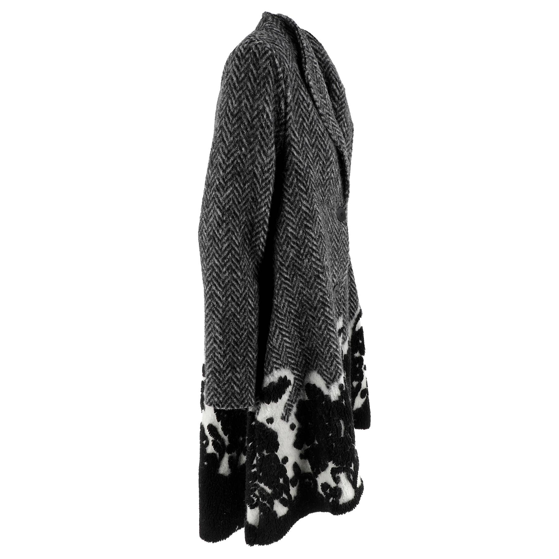 Long coat, in soft wool-blend jacquard fabric, with a wide and round cut. V-neck with lapels and central button closure. Inserted side pockets and visible stitching on the back. Long sleeves. Shorter front.