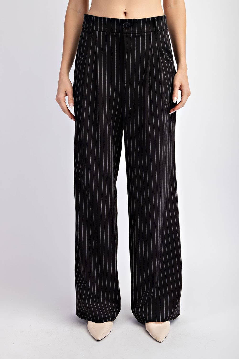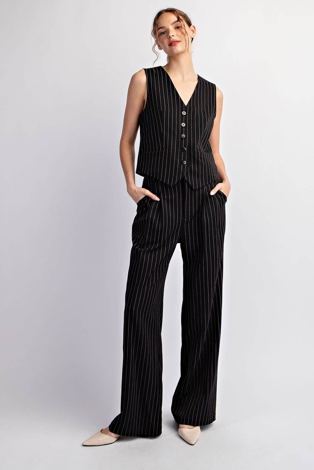 Looking for professional and sleek pants? These pinstriped long high rise trousers offer a sophisticated look. Imported and made of a durable and soft blend of 80% poly, 16% viscose, and 4% spandex making these pants both comfortable and stylish for any occasion. Pair with the matching pinstripe vest for an elevated style.