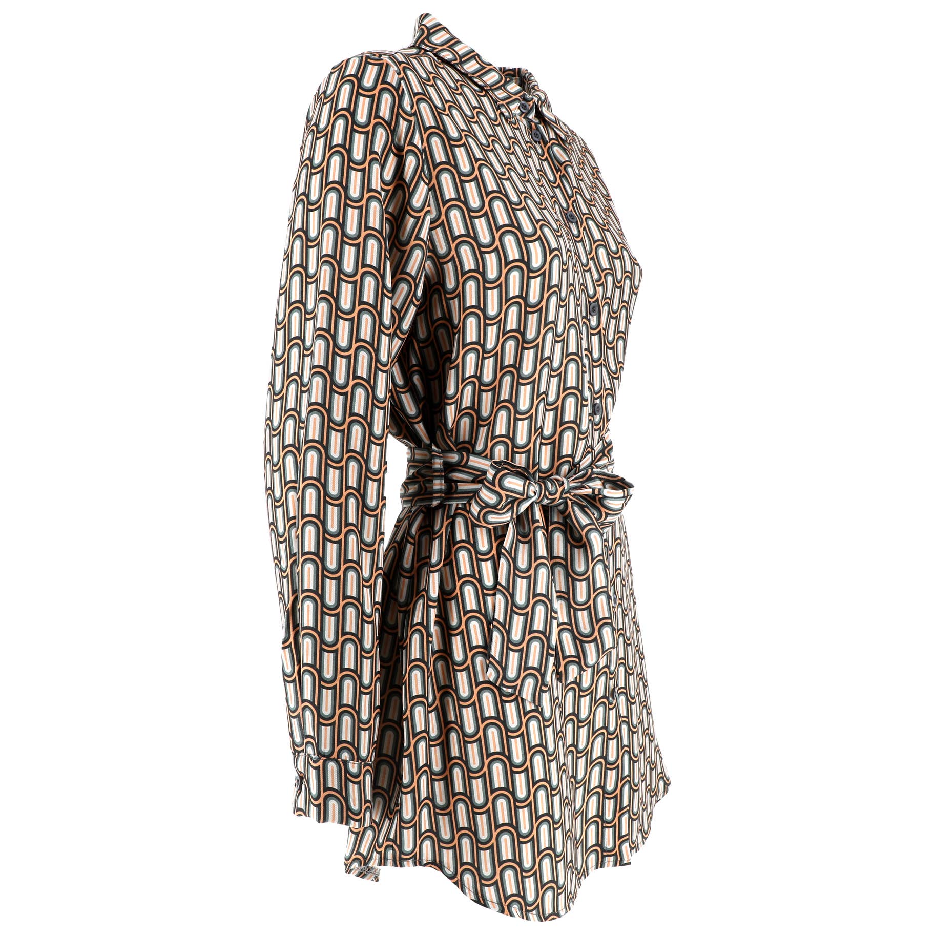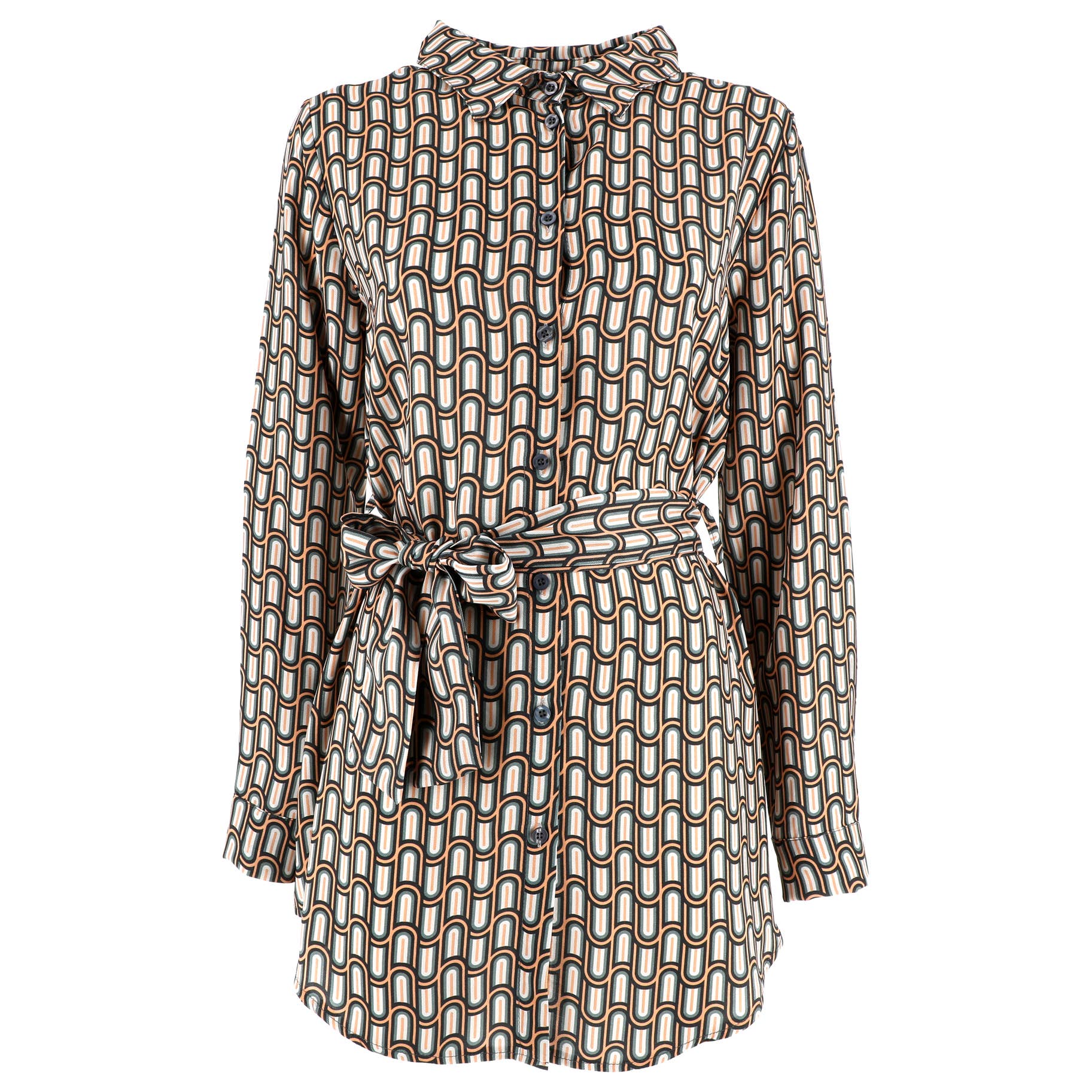 Printed dress, in soft fabric, straight shirt model. Central front opening with buttons and neckline with collar. Long sleeves with buttons on the wrists. At the waist it has printed strap loops.