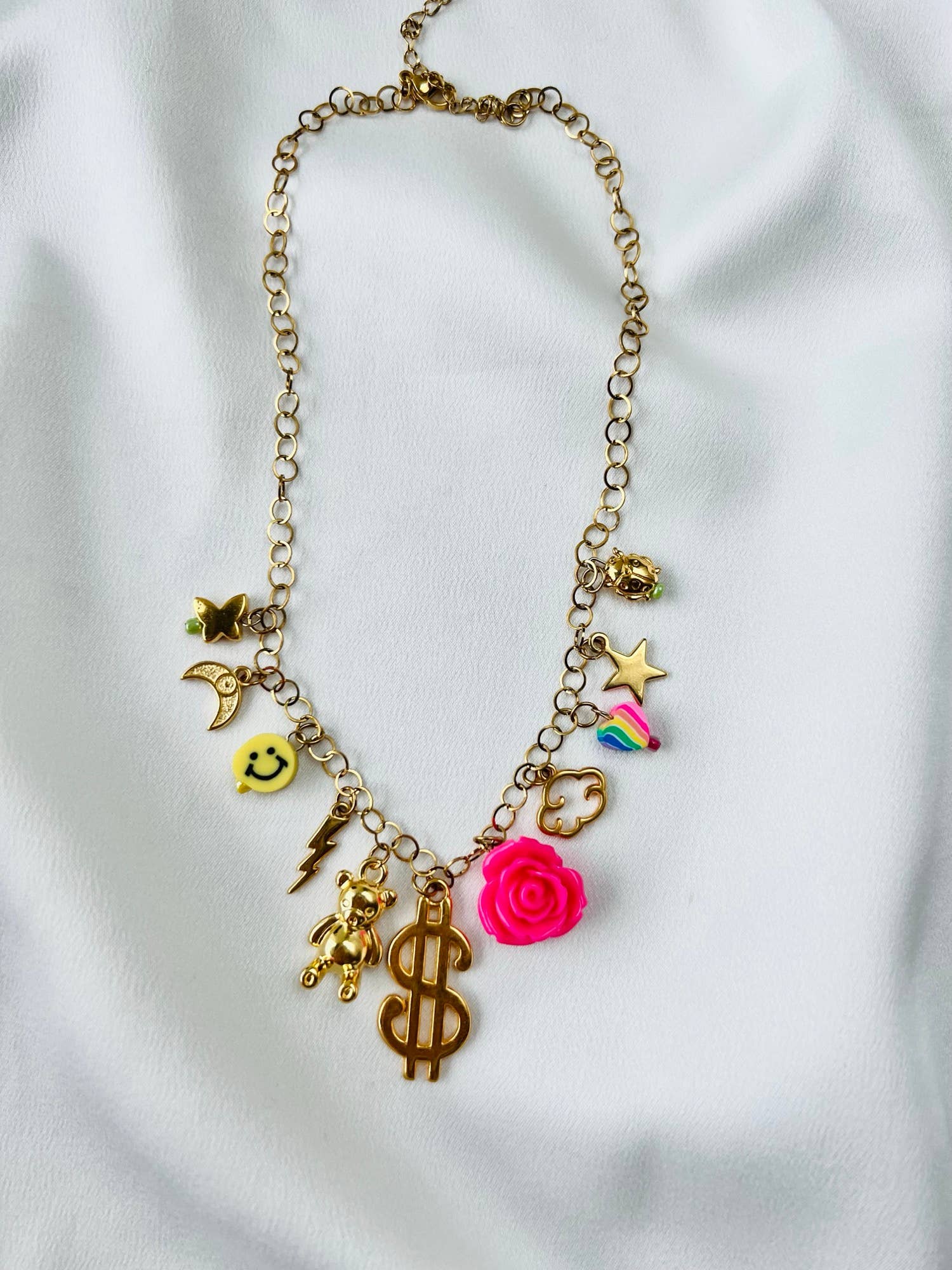 The necklace features a 38m steel chain with additional adjustment. Its charms are goldplated with 24k gold and made from copper, acrylic, glass, and fimo clay. Photos are for reference, Charms vary and no necklace is identical.