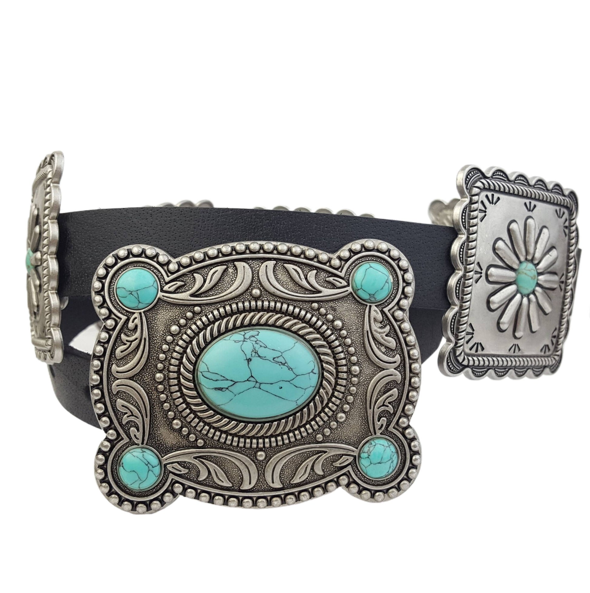 Western-Inspired high waist belt with Rectangular Concho Buckle and genuine stones. This belt buckle features high-quality, hand-picked stones and the belt is made of genuine leather. Its unique, rectangular design adds a touch of western charm to any outfit.