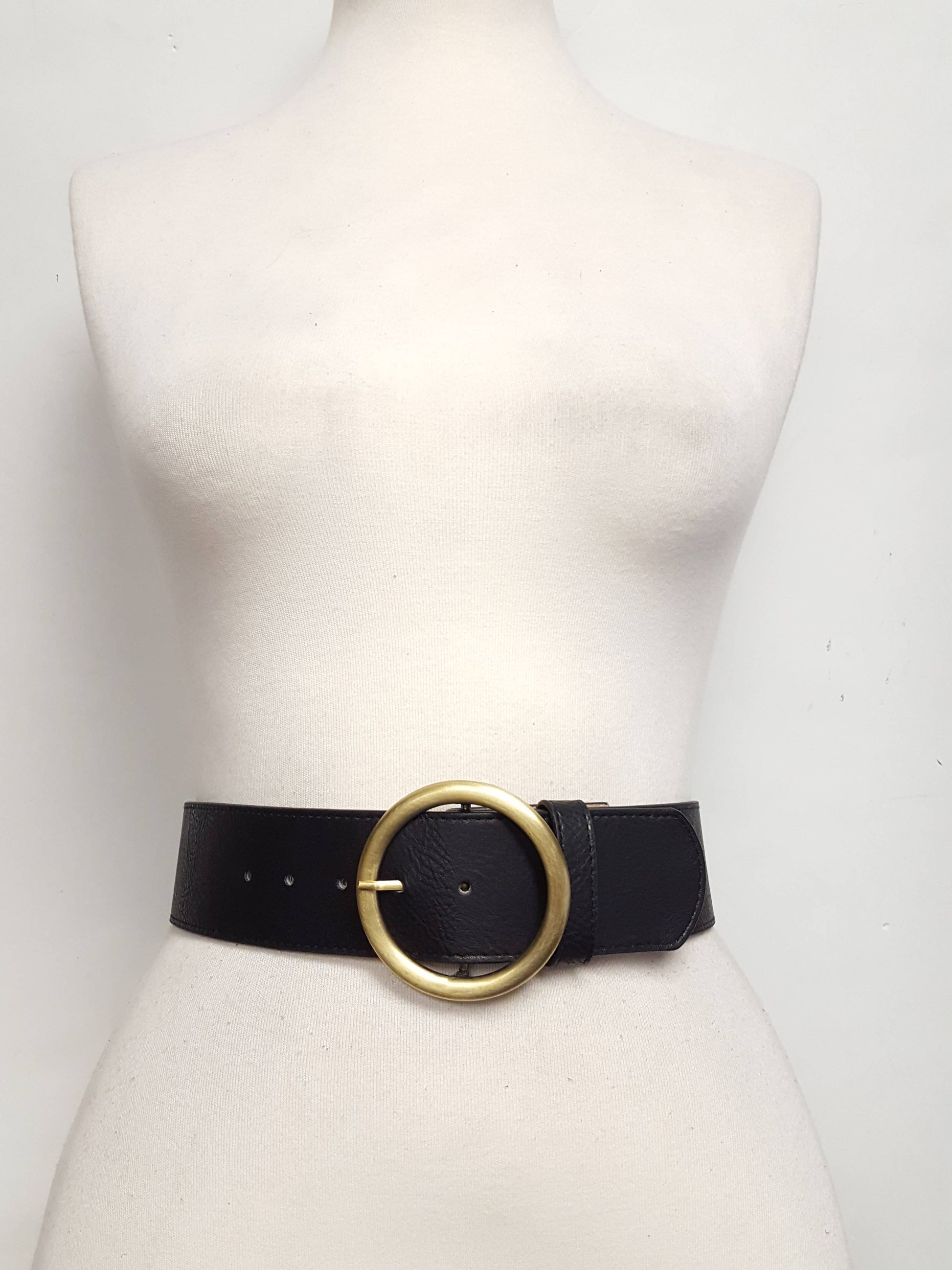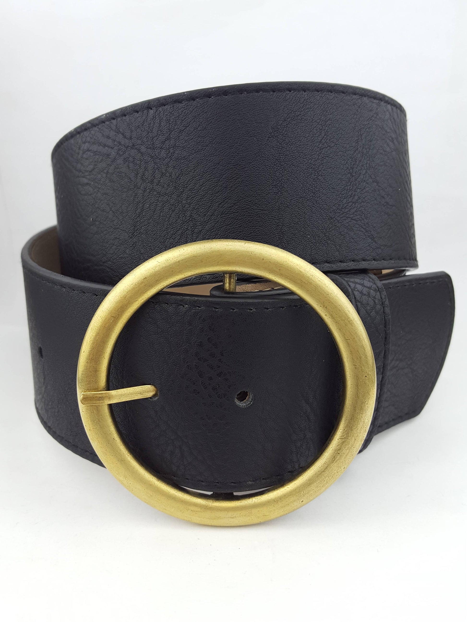 Expertly crafted with high-quality, non-animal leatherette material, this wide high waist belt adds a touch of elegance to any outfit. The brushed shiny brass buckle and faux suede backside provide a luxurious feel and ensure a secure fit. Elevate your style with this functional and fashionable accessory.